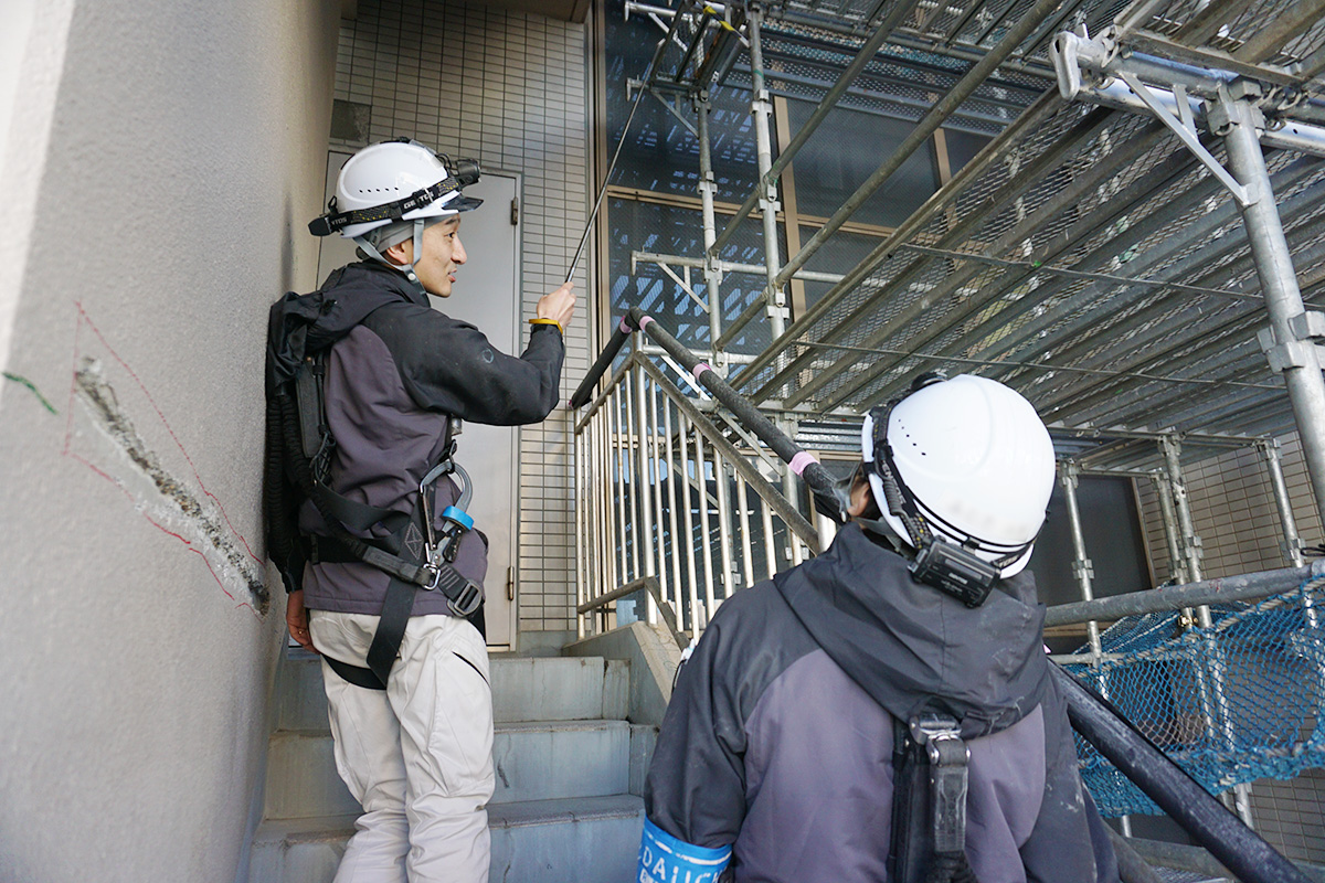 この日は、今年入社した中途メンバーと先輩社員が一緒に現場を巡回しており、先輩社員がマーキングされた補修箇所の意味や判断ポイントについて説明しながら外壁の状態を確認していました。