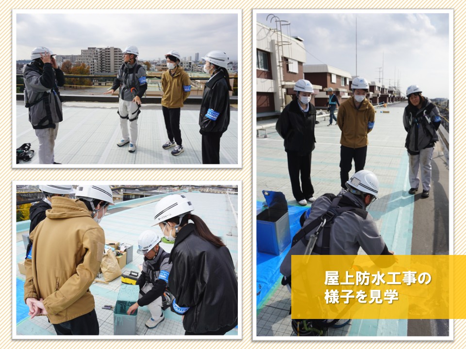 レクチャー後は、施工現場となる建物の屋上へ移動し、ウレタン防水工事の施工の様子や既存のアスファルトシート防水層を工事部が撤去する様子を見学。