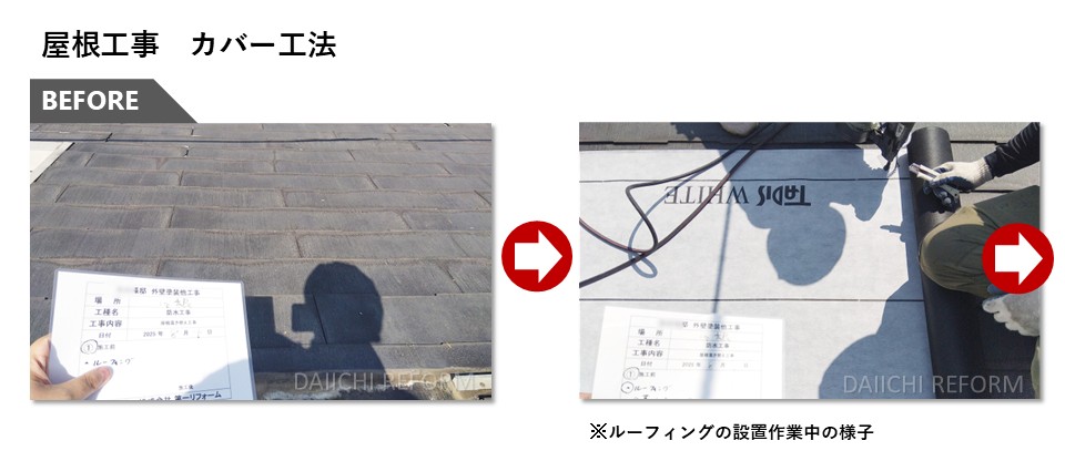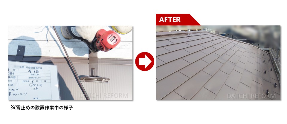 既存のコロニアル屋根の上にルーフィングシート(防水シート)を敷き、雪止めを設置し、平葺きカバールーフを設置したら工事完了です。