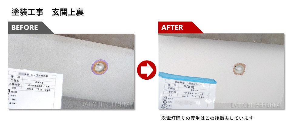 玄関の天井(上裏)は外壁と同じ色味の「水性エコファイン塗料 艶消し」で塗り替えました。