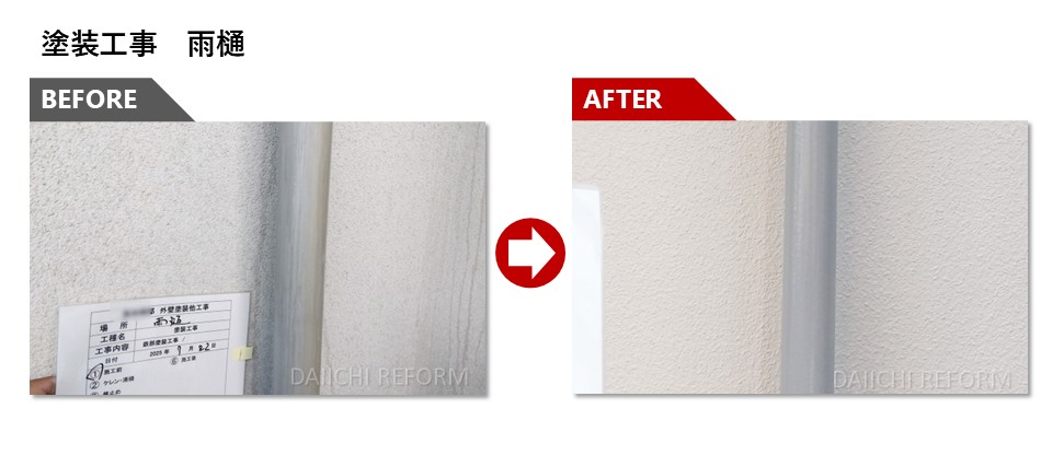 雨樋は雨垂れ汚れが見受けられました。塗り替えによりキレイになりました。