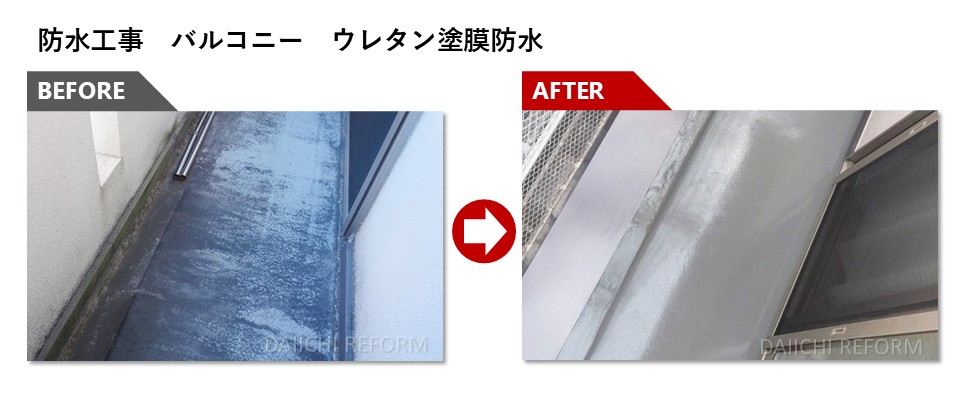バルコニー(既存:ウレタン塗膜防水)は経年による防水層の減耗が見受けられましたので、ウレタン塗膜防水工事を実施し防水層を更新しました。