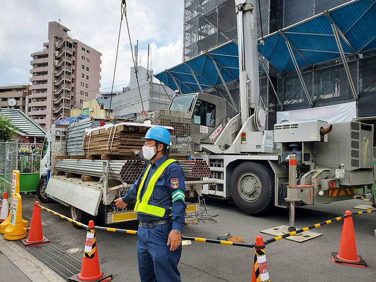 資材揚重のためにクレーン車を駐車場に停車させたり、足場資材の運搬・搬入のためにトラックを駐車場に停車させたりと、駐車場スペースを利用して工事車両の搬入・停車をする場合があります。
