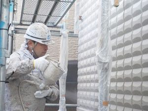 外壁を塗り替えるため、塗装作業が行われます。