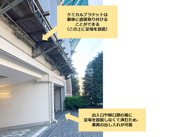 建物構造や強度など一定の条件を満たす場合に限り、ケミカル(アンカー)ブラケットと呼ばれる特殊な足場を設置することが可能です(原則、主要構造物となる梁に設置する)。
