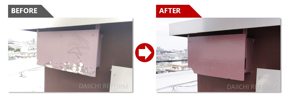 屋上の各所ガラリパネルにおいて、経年による変退色や塗膜の剥がれや錆の発生が見受けられましたので塗り替えを行いました。