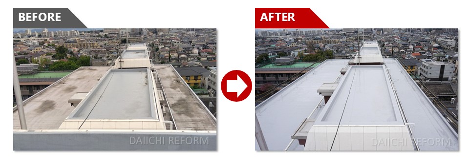 竣工から50年以上が経過しており、複数回アスファルトシート防水による屋上防水改修工事が行われていたため、今回はウレタン塗膜防水通気緩衝工法にて改修を行いました。
