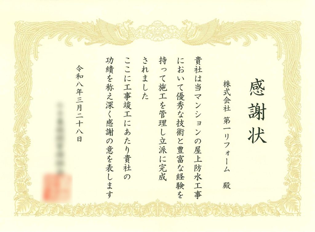 管理組合様より「現場代理人の方がすごく頑張って対応をしてくれました。ありがとうございました。」と感謝状をいただくことができました。