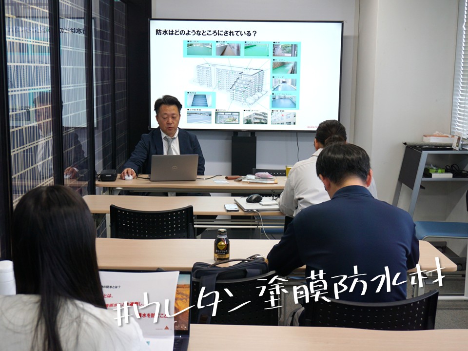 メーカー研修とは、大規模修繕工事に使用される材料のメーカーさんから直接、材料に関する基礎知識・製品の特徴等ついて学ぶ研修です。