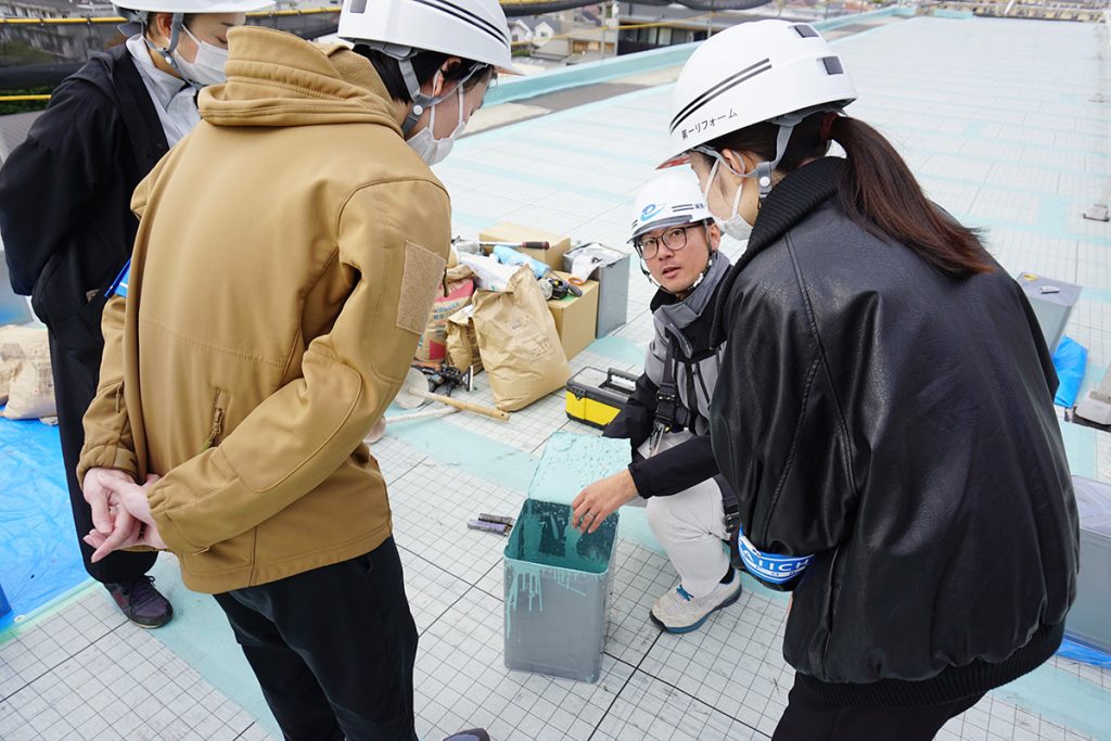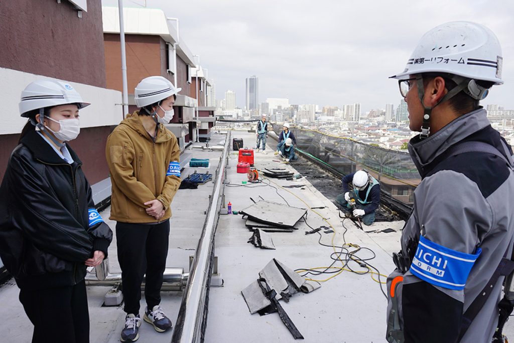 レクチャーを終えたら、作業が行われている屋上へ移動。防水工事の様子を見学しました。